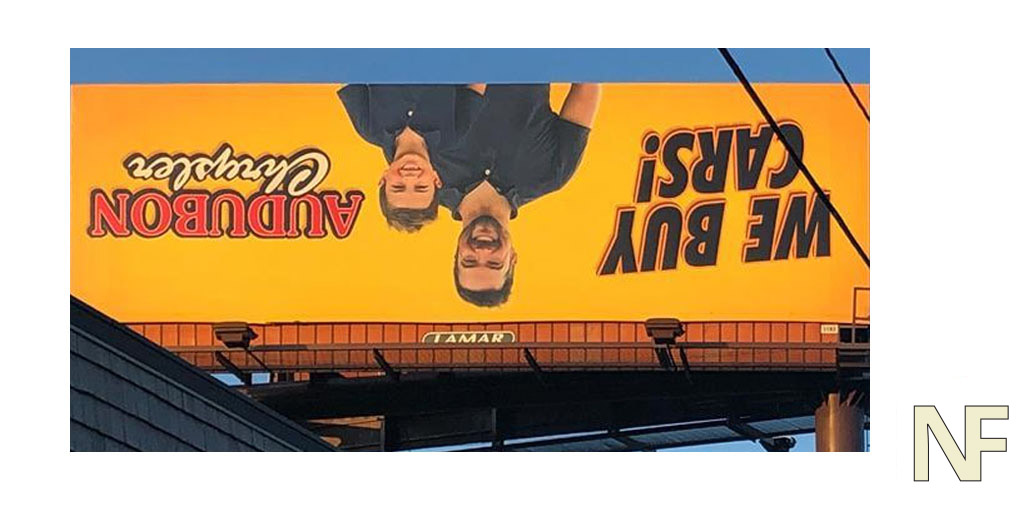 Audubon Chrysler you probably haven’t heard of unless you’re from Evansville, Indiana. They are a car dealership with a hefty billboard campaign. Everyone in the area recognizes their logo, the font choice, the minimal colored background. Since everyone knows the brand they got away with something so stupid it’s brilliant, they printed them upside down. The message was so simple you couldn’t miss it “We Buy Cars” and people talked about them for weeks, and not all of the talk was good. Most were talking about if it was a mistake or not. One of my former design professors, Chuck Armstrong, posted about how much he disliked it. This sort of gimmick comes with two warnings: your client better be okay with “there is no such thing as bad press.” ethos, and you can only do it once.