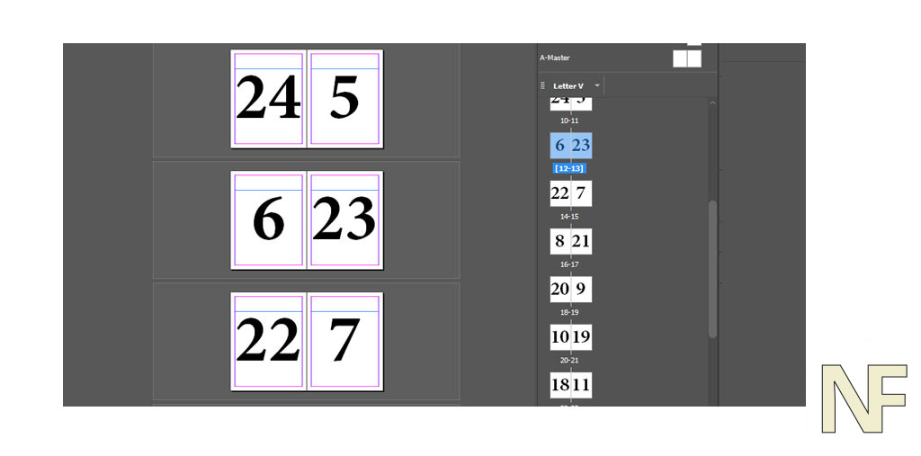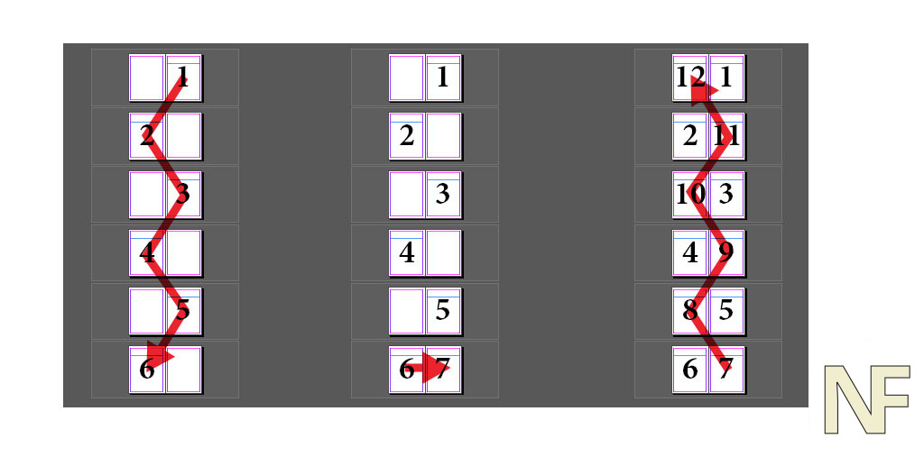 On the next spread down in your layout, drop your 2 on the left side. Next spread, drop 3 on your right. Do this back and forth until you hit the bottom (which should be the half number of all pages, in this case, 6). This is where you reverse, drop the 7 across from the 6, and go right back up filling in as you go.