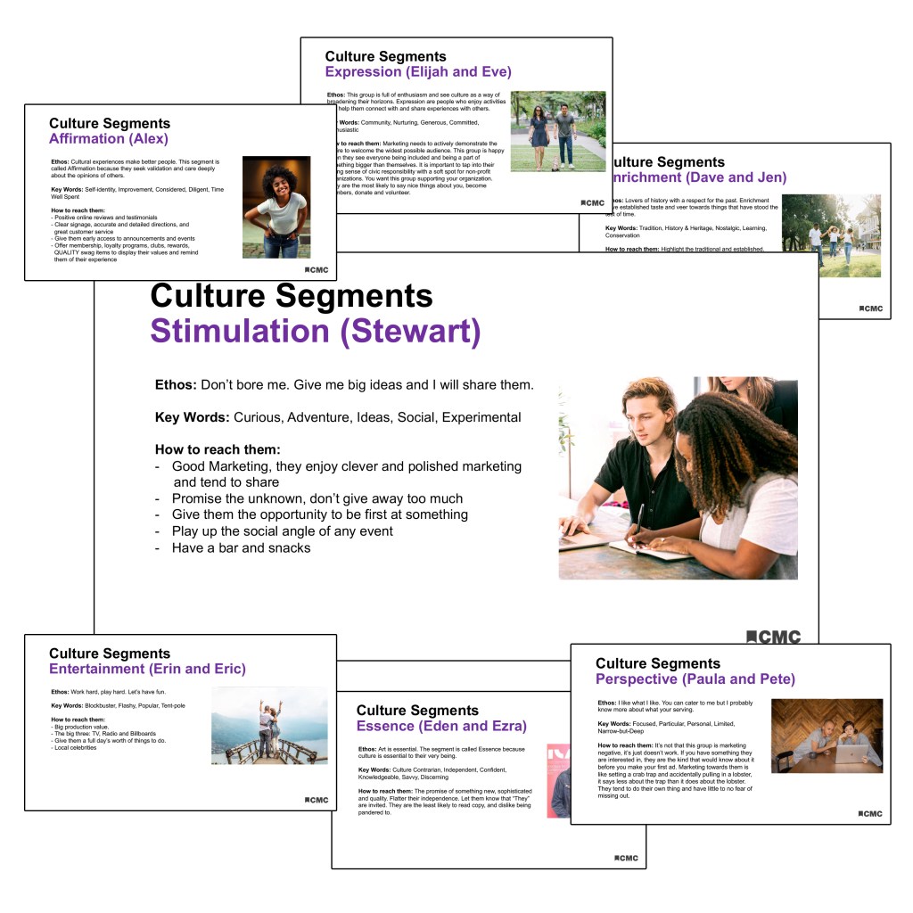 At the Cincinnati Museum Center, my team was in charge of several projects focused on strategy. One such project was our initiative on Culture Segmentation Personas. The end goal was to better serve our guests based on behavior and emotional empathy, using user experience data and the tenets of UX design and Heuristic research. I was the design lead on the project, compiling data from the team and synthesizing that data into easy to consume personas presentation. We presented to the Leadership, Education, and Philanthropy teams for internal use, creating a successful cross discipline tool for company wide use.