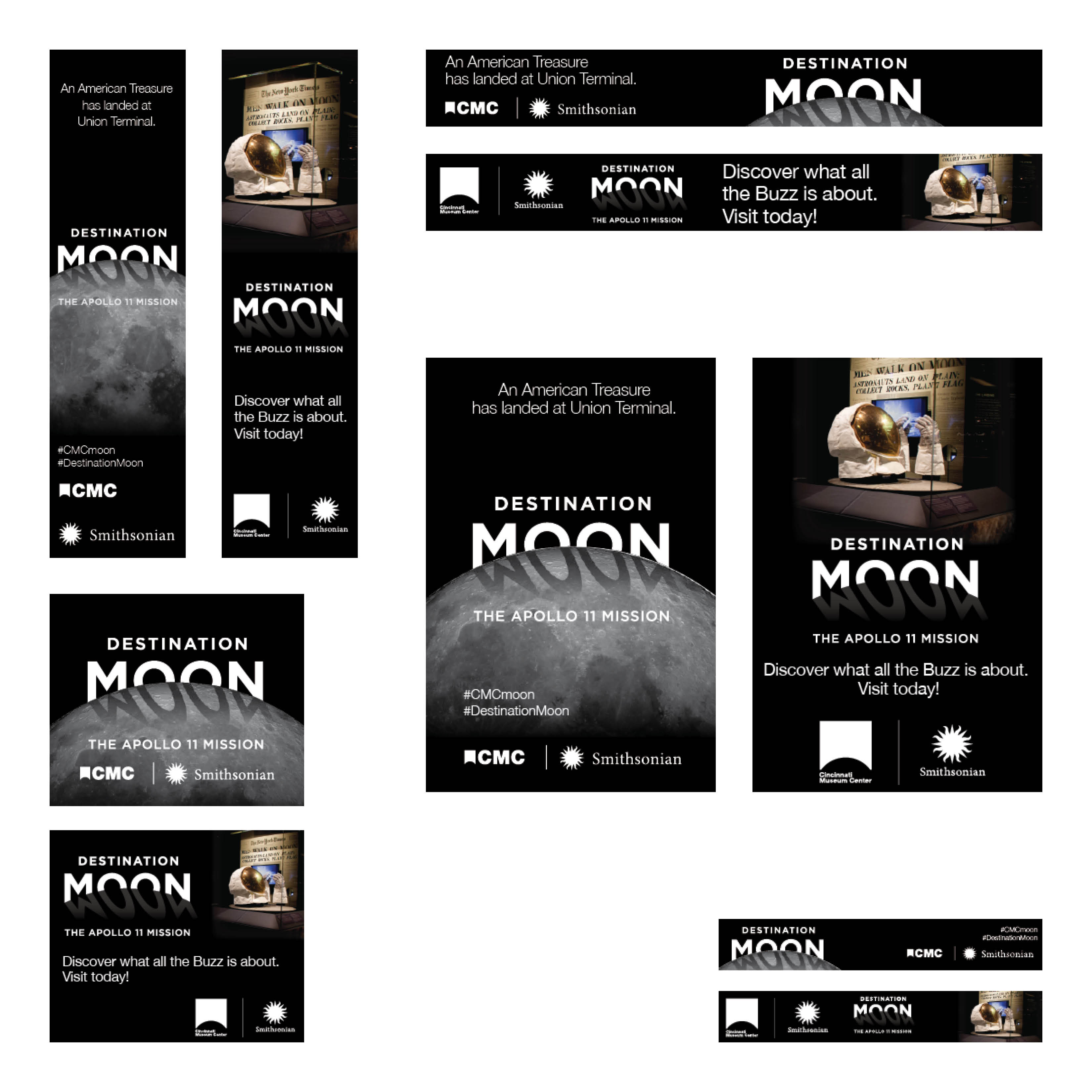 Destination Moon was a special traveling exhibit from The Smithsonian, and with it came a lot of design requirements. They provided their own assets for digital promotion, and when I wanted to A/B test new creative they were hesitant. I showed them the new designs, featuring the helmet of Buzz Aldrin, something breathtaking and physical that the viewer could relate to, and they eagerly approved it. The new creative out preformed the older and we switched the ad’s over entirely.